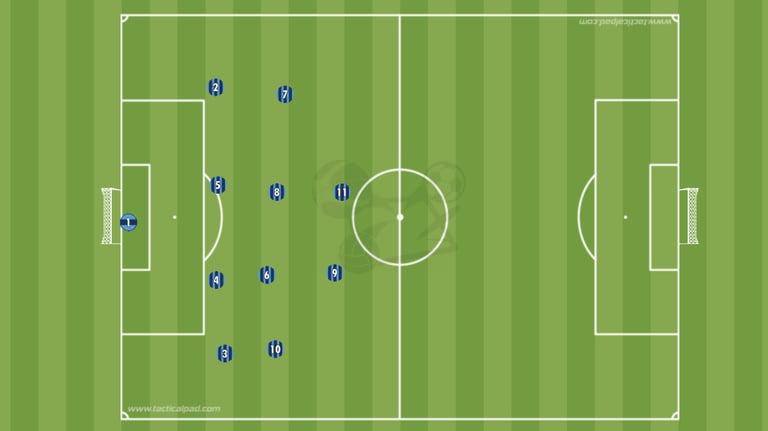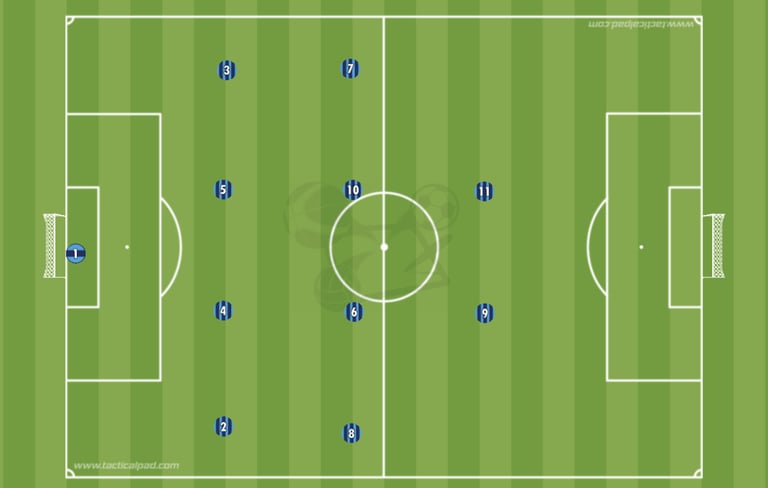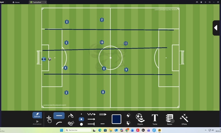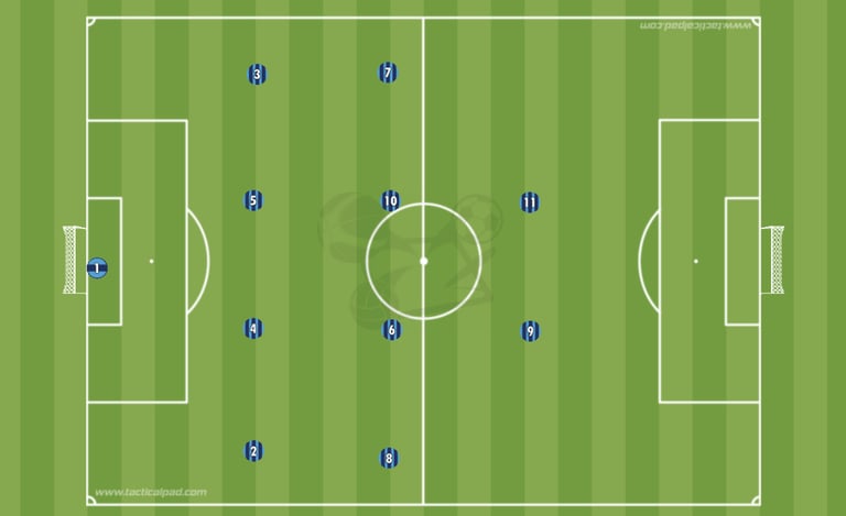 La 1er version c’est le classique, le 4-4-2 à plat, sur chaque ligne on est aligné et on occupe toute la largeur du terrain.